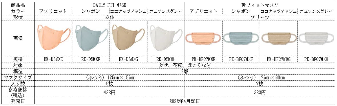 新型コロナウィルスの感染拡大が長期化し、ファッションやメイク、季節や生活・仕事のシーンに合わせて、カラーマスクを着用する人が増えています。こうした変化に対応するため、当社は昨年7月より、DAILY FIT MASK(立体)及び美フィットマスクに10色のカラー・バリエーションを追加して発売しました。さらに本年2月には、春のファッションやメイクに調和する4色のニュアンスカラーを追加し、カラーマスクのラインアップを充実させています。