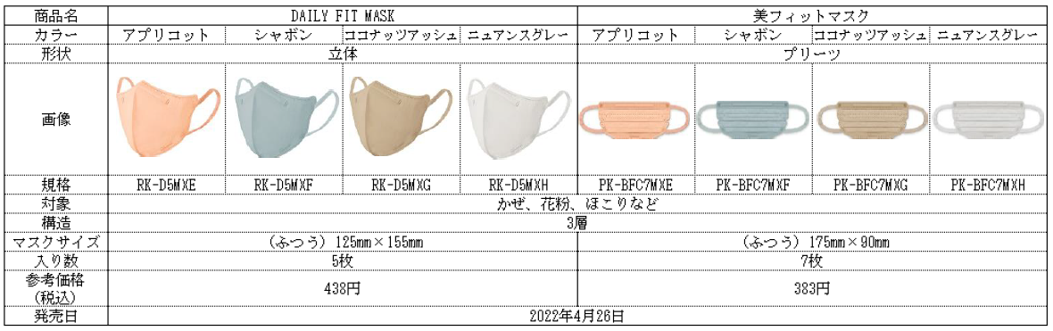 新型コロナウィルスの感染拡大が長期化し、ファッションやメイク、季節や生活・仕事のシーンに合わせて、カラーマスクを着用する人が増えています。こうした変化に対応するため、当社は昨年7月より、DAILY FIT MASK(立体)及び美フィットマスクに10色のカラー・バリエーションを追加して発売しました。さらに本年2月には、春のファッションやメイクに調和する4色のニュアンスカラーを追加し、カラーマスクのラインアップを充実させています。